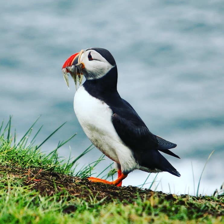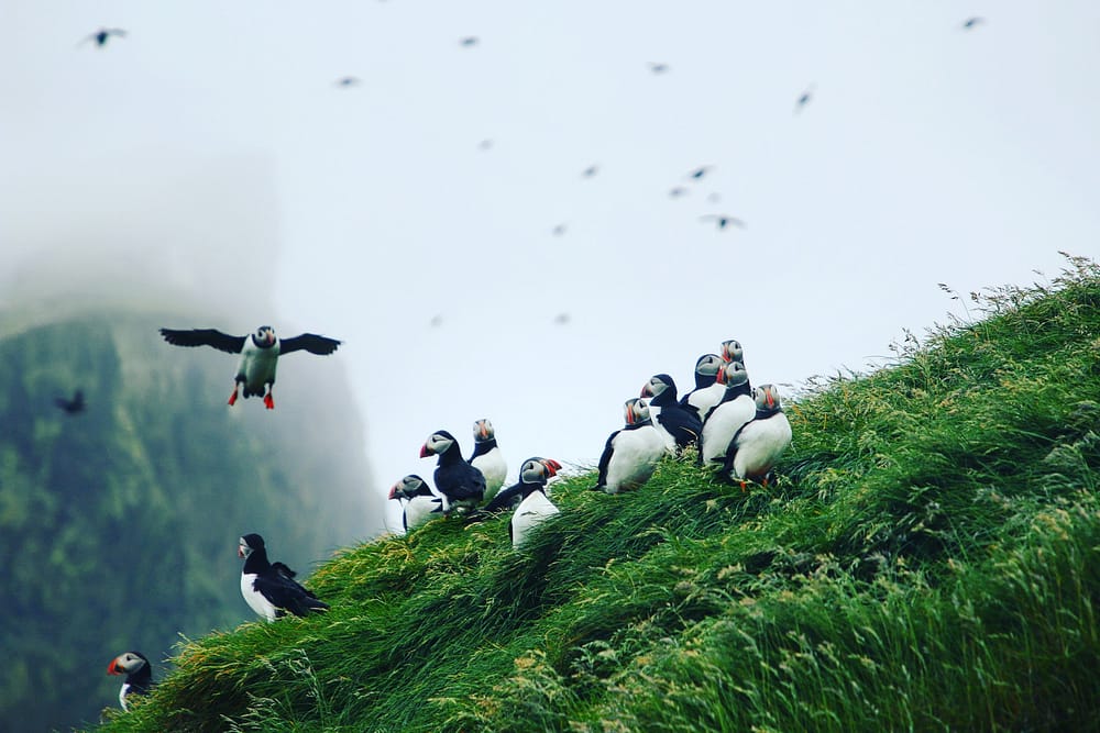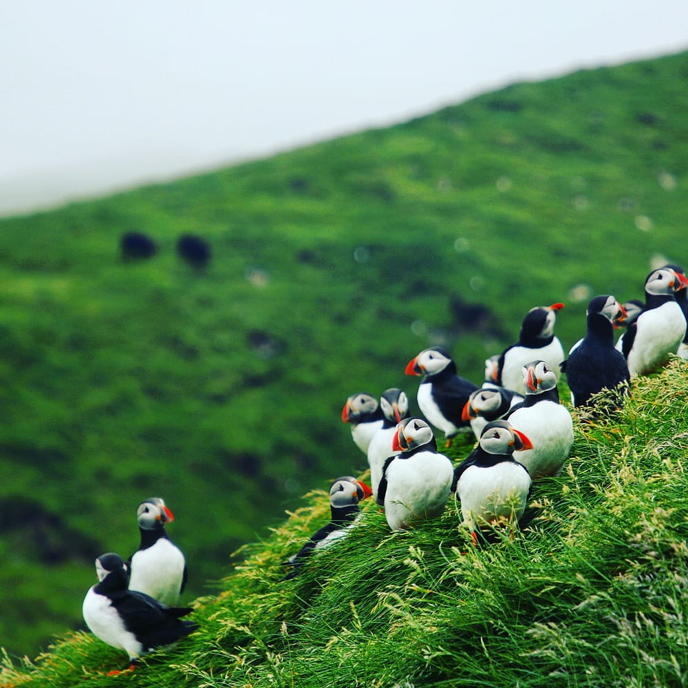 De wandeling gaat meteen steil naar boven. Gelukkig zit het daar boven vol met de beloofde puffins. Het verdere uitzicht is maar matig (mistig), De grote telelenzen worden bovengehaald en zorgen voor files.