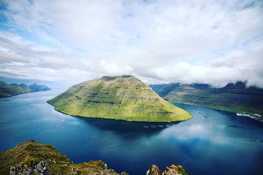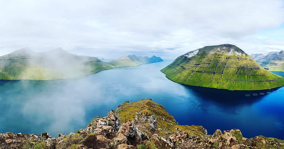 Het zicht is prachtig, en 360° zoals beloofd inclusief een mooi zicht op Klasksvik en het eiland Kalsoy. Een ideale plek om ons middagmaal te verorberen. Halverwege dat middagmaal slaat het weer om en verschijnen er grote wolken. Het zicht verdwijnt volledig en het begint te druppelen. De mensen die nu pas naar boven komen zijn er aan voor de moeite of zullen wat geduld moeten uitoefenen.