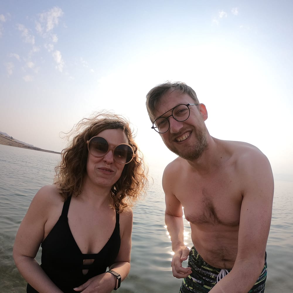 Uiteraard kan je niet vertrekken zonder de obligatoire “zie mij drijven” foto. Gevolgd door de “zie mij hier lezen in mijn reisgids van Jordanie” foto. Ook wij zijn hier deels schuldig aan (de modder lieten we aan ons passeren, de rij aan de verfpot was net iets te lang).