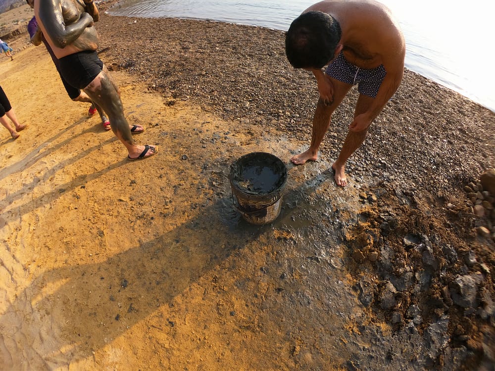 Het strand van ons hotel (het gigantische Dead Sea Spa Hotel) leek net iets meer op een industriegebied waar nog volop gebouwd werd. Er werd ook effectief nog gewerkt aan een huisje met faciliteiten. Ook terwijl een 50-tal mensen zich stonden in te smeren met modder uit de Dode Zee. Of modder uit een gerecycleerde verfpot. Want dat is ‘a thing’ daar. Ieder om de beurt. Daarna allemaal onder de douche, toen nog net tegen het water, nu waarschijnlijk al wat verder …