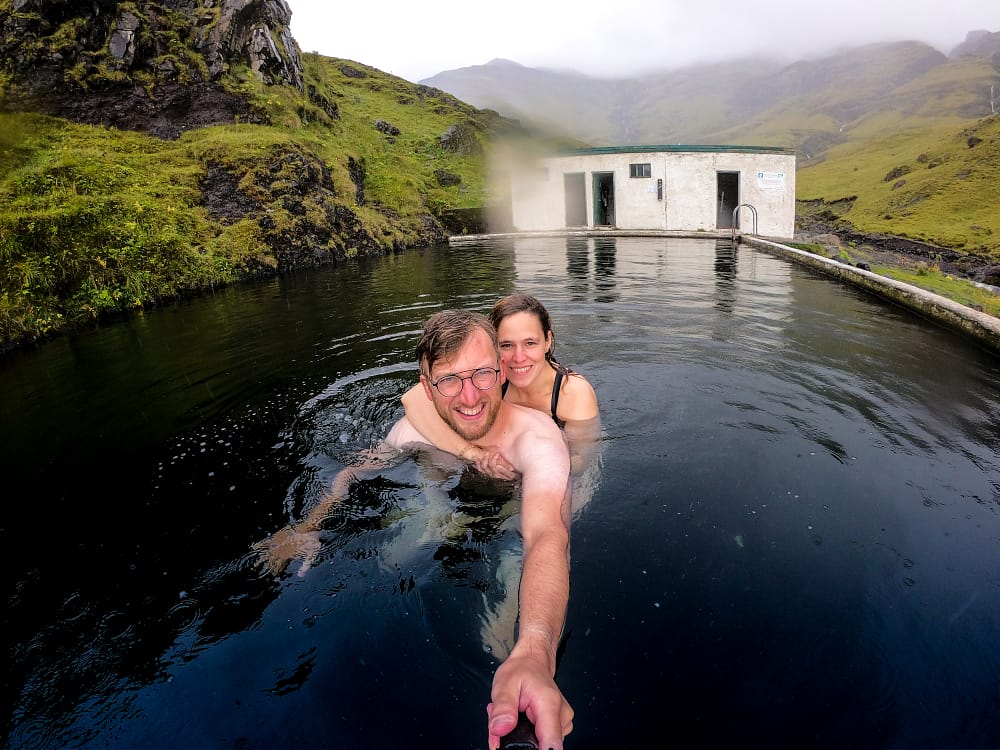 - Review: Het oudste zwembad van IJsland, met warm water (het water is niet zo warm als in de andere hot springs omdat dit zwembad ‘aangevuld’ wordt met water uit een hot spring en niet gewoon de hot spring zelf is). Gelegen in het midden van de natuur en enkel te voet te bereiken. Verwacht geen zwembad met faciliteiten. Op je blote voeten rondlopen aan het zwembad is pure horror (Fotograaf van dienst Jonas kan er van meespreken) en de ‘kleedhokjes’ zijn vies en vuil. Toch heeft deze plaats iets magisch. Een groot deel van de tijd hadden we het hele zwembad voor ons. Dat gecombineerd met het feit dat je in het midden van de natuur zit, in een zwembad met water van om en bij de 30-35°c, is fantastisch.