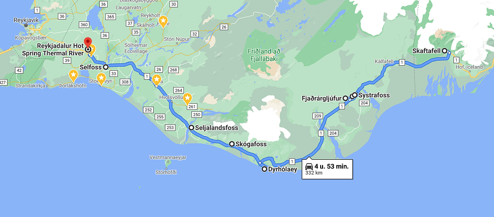 Traditioneel begin je in Ijsland met de Golden Circle. Mensen die slechts voor een paar dagen naar Ijsland komen, doen enkel deze route. Met Thingvellir National Park (met daarin Silfra, waar je kan snorkelen tussen de twee tectonische platen in ijskoud water), Laugarvatn (een groot meer, inclusief warmwaterbad), Geysir (de naam zegt het zelf …) en Gullfoss (een gigantische waterval), heb je al even je werk. In het terugrijden kan je eventueel stoppen aan de Secret Lagoon en Kerid (een krater).