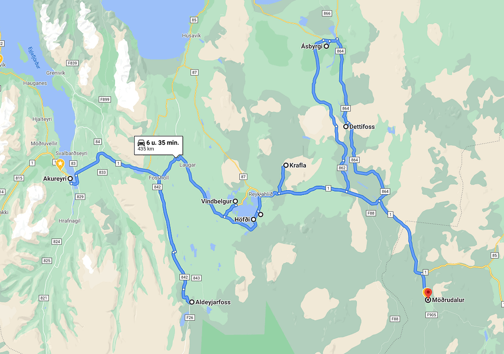 Vanuit Akureyri gaat het naar Myvatn via de VEGGJALD tunnel (niet vergeten op voorhand online te tol te betalen). Maak gerust even een omweg via de Aldeyjarfoss, een grootse waterval. Met een gewone wagen geraak je tot op enkele kilometers van de waterval, een 4×4 brengt je helemaal op je bestemming.