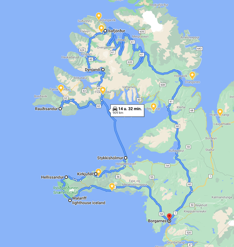Het rondje IJsland is hier afgelopen (je kan terug naar Reykjavik rijden), maar er ontbreken nog enkele stukken in het westen: Sneafelsess en de Westfjords. Op weg ernaartoe passeer je Borgarnes, een stadje waar je kan doorrijden of eventueel het Settlement Centre bezoeken.