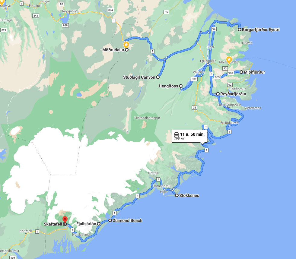 De route loopt verder langs de kustlijn. Een belangrijke stopplaats is Diamond Beach, veroorzaakt door de gigantische Jökulsárlón gletsjer. Een grote parking zorgt dat er altijd plaats is. Even verder liggen nog twee andere gletsjermeren (Fjallsárlón en Breiðárlón), een mooi wandelpad verbindt de twee (en van daaruit kan je ook doorlopen naar het Jökulsárlón meer, maar dat is best een lange wandeling).