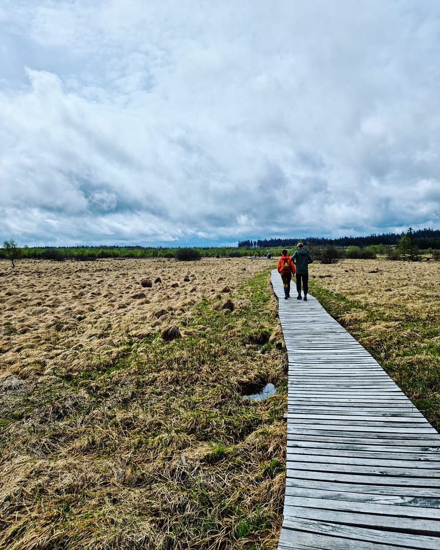 We starten bij de Signal de Botrange, lopen over vlonders en over deinende moddervelden. We slagen erin het weer én de modder te trotseren mét buggy. Da’s al meer dan wat kan gezegd worden van menig witte sneaker. Hoge venen en sneakers: does not compute.