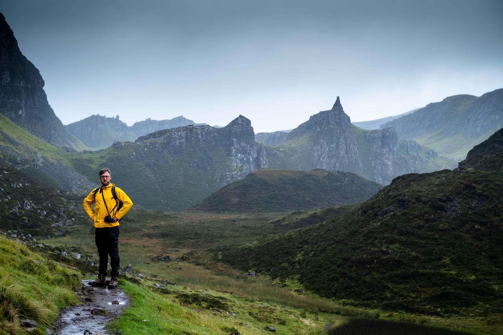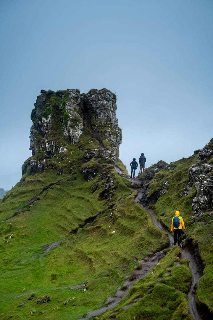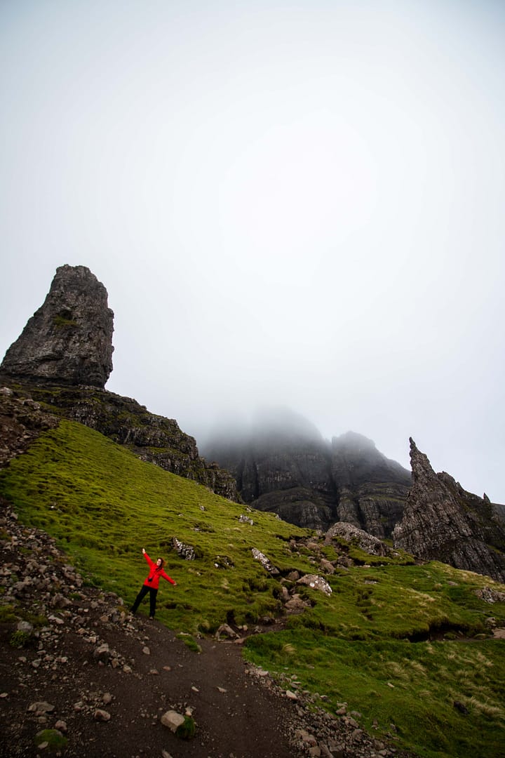 We hadden het geluk dat het nog vrij vroeg was en de wolken nog niet wakker waren. Wind was er wel, dus sommige stukken (vooral op het hoogste stuk van de wandeling) deed ik helaas weer brilloos. Bij regenweer wel even opletten, want het pad lijkt zowat elke kant uit te gaan en bepaalde stukken waren zeer modderig. Tegen het moment dat we het hoogte punt (toch dat van ons) bereikten hadden dikke wolken The Old Man of Storr al helemaal opgeslokt en was de zichtbaarheid beperkt geworden.