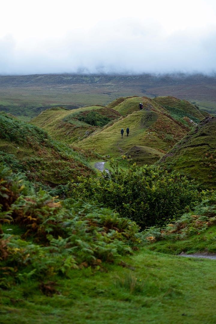 En dan, plots … klaarde het een beetje op. De mist leek weg te trekken en we kregen zowaar de parking terug in zicht. Euforie! Tijd voor een dansje? Neen, helaas. The Quiraing had nog één verrassing voor ons in petto: Een stukje waar het gewoon zo steil naar beneden ging (en het pad eigenlijk ontbrak), dat de beste tactiek voor ons ‘zitten en schuifelen’ was. Helaas geen foto’s van dit partijtje schuifelen.