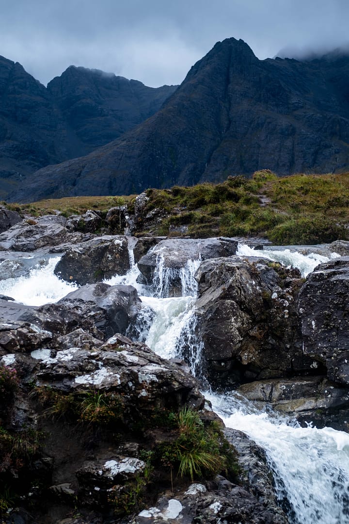 Toegegeven, hier wisten we niet meteen of we nu bij de juiste ‘pools’ stonden, maar het zagen er ‘pools’ en watervallen uit. Hier had Skye heel veel regen op ons afgestuurd. De rivier was dus een kolkende massa geworden. Niet meteen een pluspunt als je die rivier ook daadwerkelijk een aantal keer moet oversteken. Er liggen dan wel stenen op strategische plaatsen, maar niet iedereen is tegen de dubbele meter lang en ja, … geen avonturiers he.
