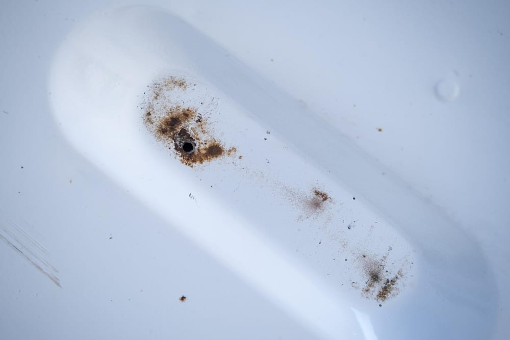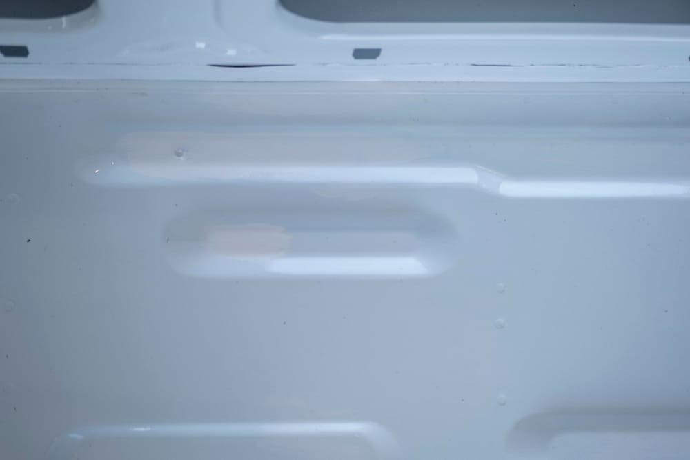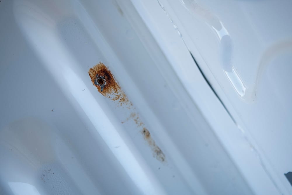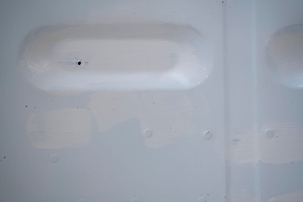 Na het verwijderen van de vloer bleek dat we een aantal kleine roestplekken hadden – meestal plaatsen waar de vloer via een vijs was vastgezet. Verder bleek ook dat er een aantal plaatsen waren waar er een kleine schram in de metaallak was.