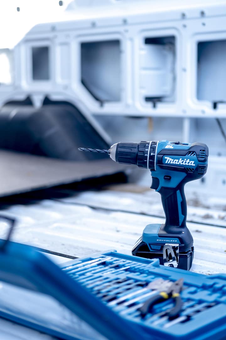 Hoe zijn wij begonnen met het verwijderen van het tussenschot? We namen een boormachine en ontdekten onmiddellijk dat onze bitjes niet het juiste formaat hadden. Onze eerste stap was dus een ’terug naar afzender’ richting doe-het-zelfzaak. Zodra we de juiste stuks hadden, ging het verbazingwekkend vlot, zoals je ook hieronder kan zien in de timelapse: