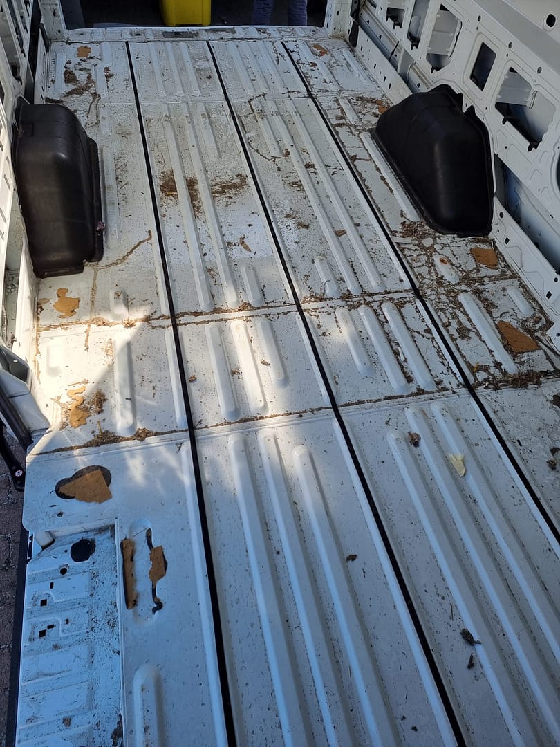 Realiteitscheck: we zijn langer bezig geweest met het kuisen van de campervan dan met het ontmantelen van de wanden en vloeren. Nadat we de vloeren en wanden verwijderd hadden zagen we dat stof en vuil toch echt wel overal kruipt waar het maar kan: