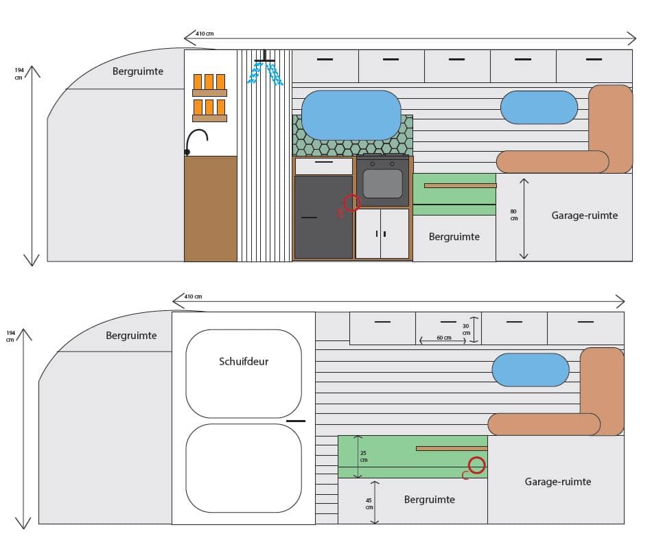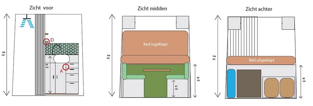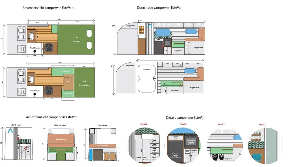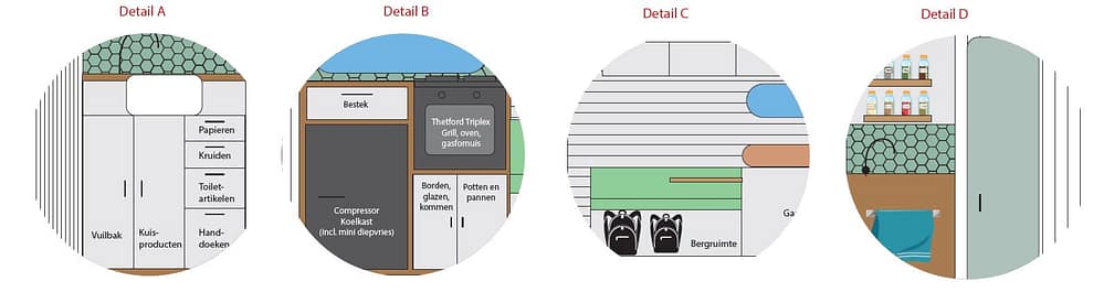 Ook hier hebben we twee aanzichten uitgewerkt: eentje per kant van de camper. Hier is enkel een zicht gemaakt bij een ingeklapt bed – omdat we dit detail nu eenmaal nodig hebben.