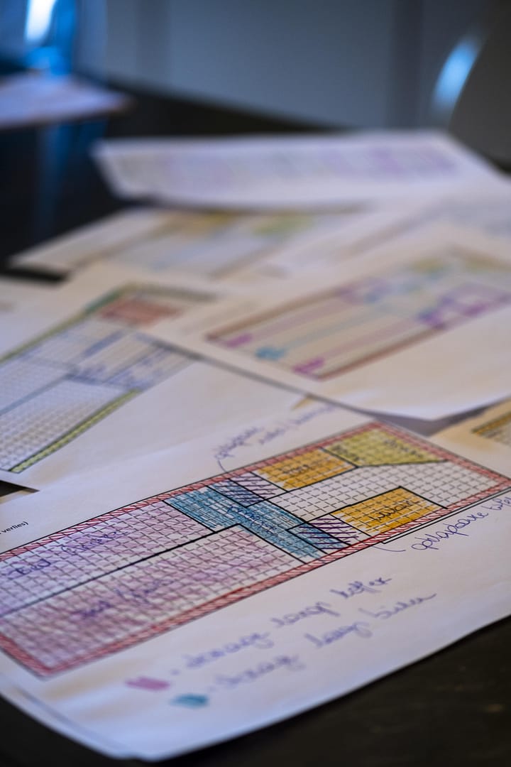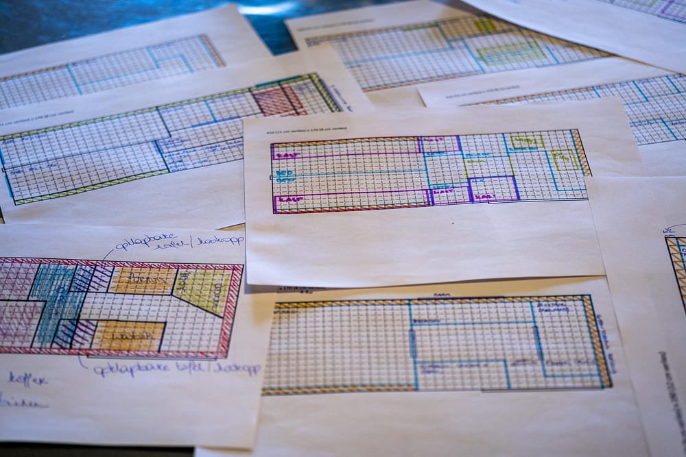 Voor ons werkte dit erg handig: we maakten in Excel een rechthoek op schaal die we vervolgens in tienvoud afdrukten. Met pen, potlood en stift gingen we vervolgens op deze prints ruwweg onze ideale scenario’s uittekenen. Zo hebben we de grote brokken uitgewerkt, alsook onze ruwe elektriciteits-, gas- en waterbevoorrading.
