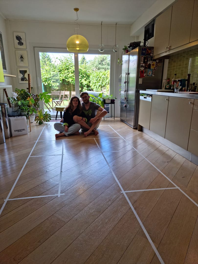 Nadat we merkten dat we steeds minder en minder iteraties moesten maken op onze schets, hebben we in onze woonkamer alle meubels aan de kant geschoven en zijn we op ware grootte beginnen afplakken. Zo kregen we toch net iets meer gevoel bij de schets en konden we ook snel uitmaken of onze schets realistisch was.