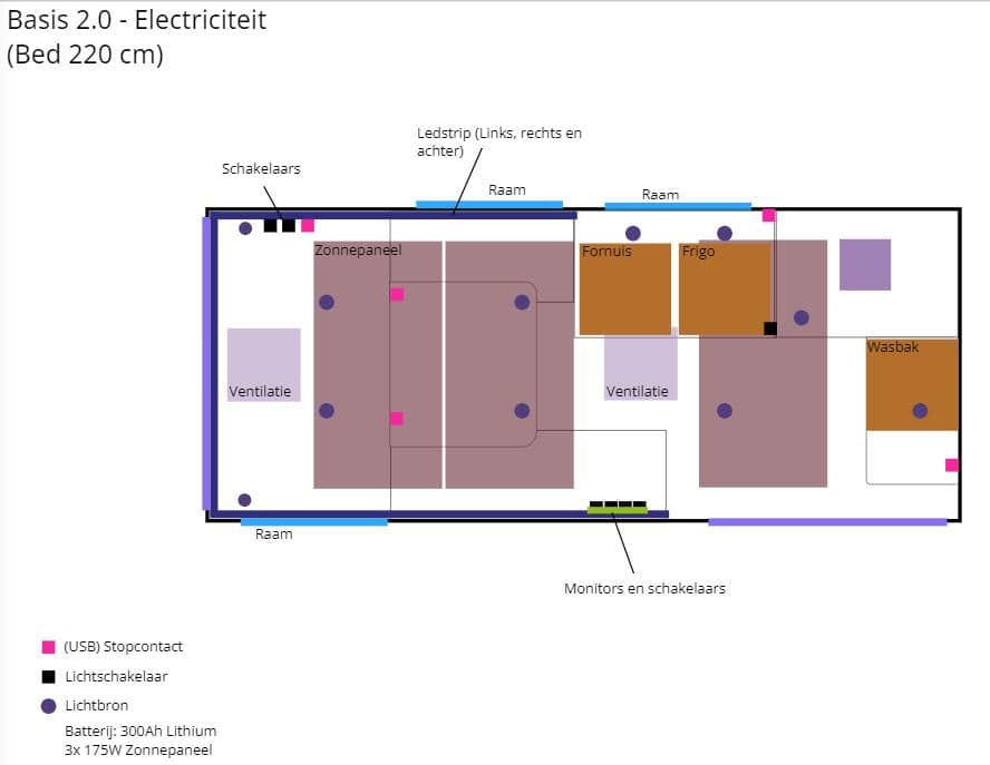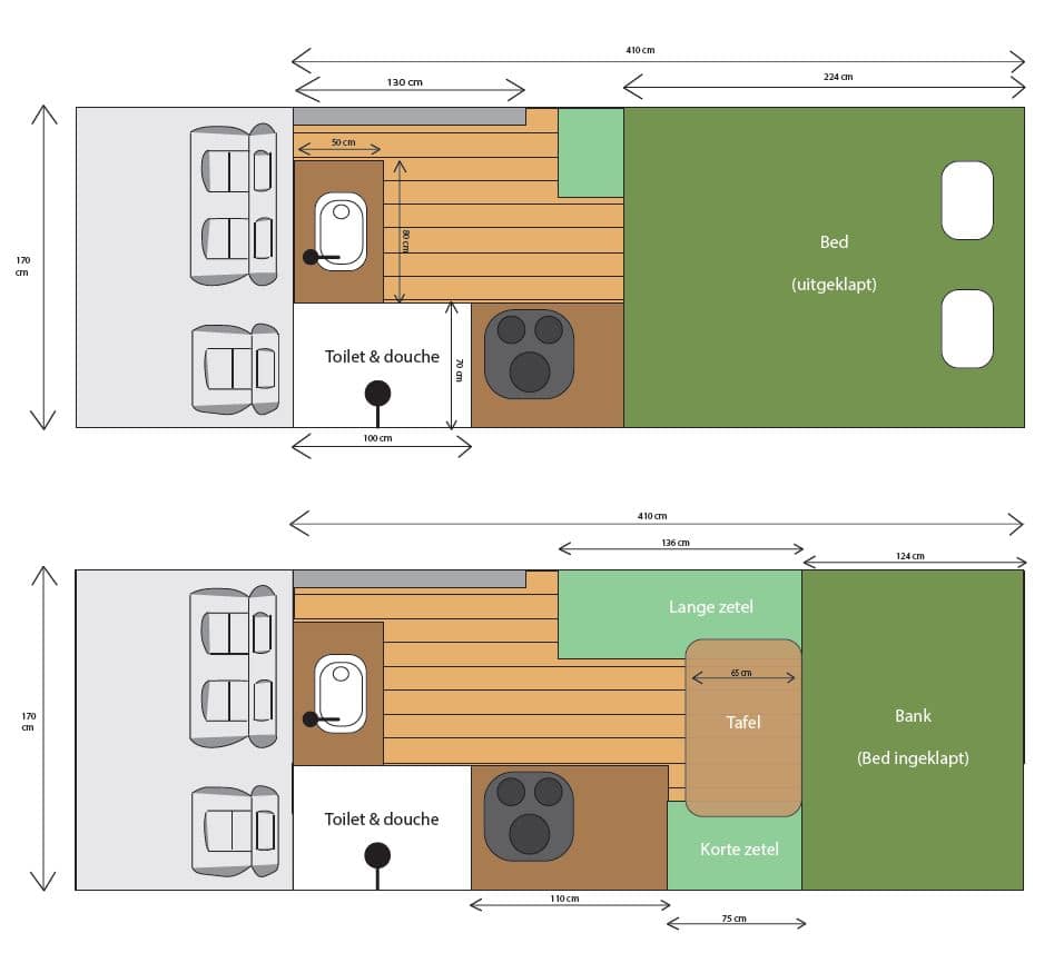 Voor het bovenaanzicht tekenden we twee schetsen uit: eentje waarbij het bed uitgetrokken is en eentje waarbij het bed ingeklapt is. Dit geeft ons dus een zicht op de dag/nacht situatie van de campervan.