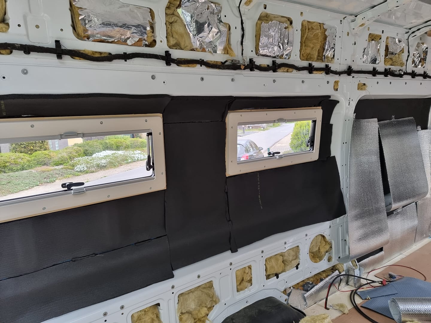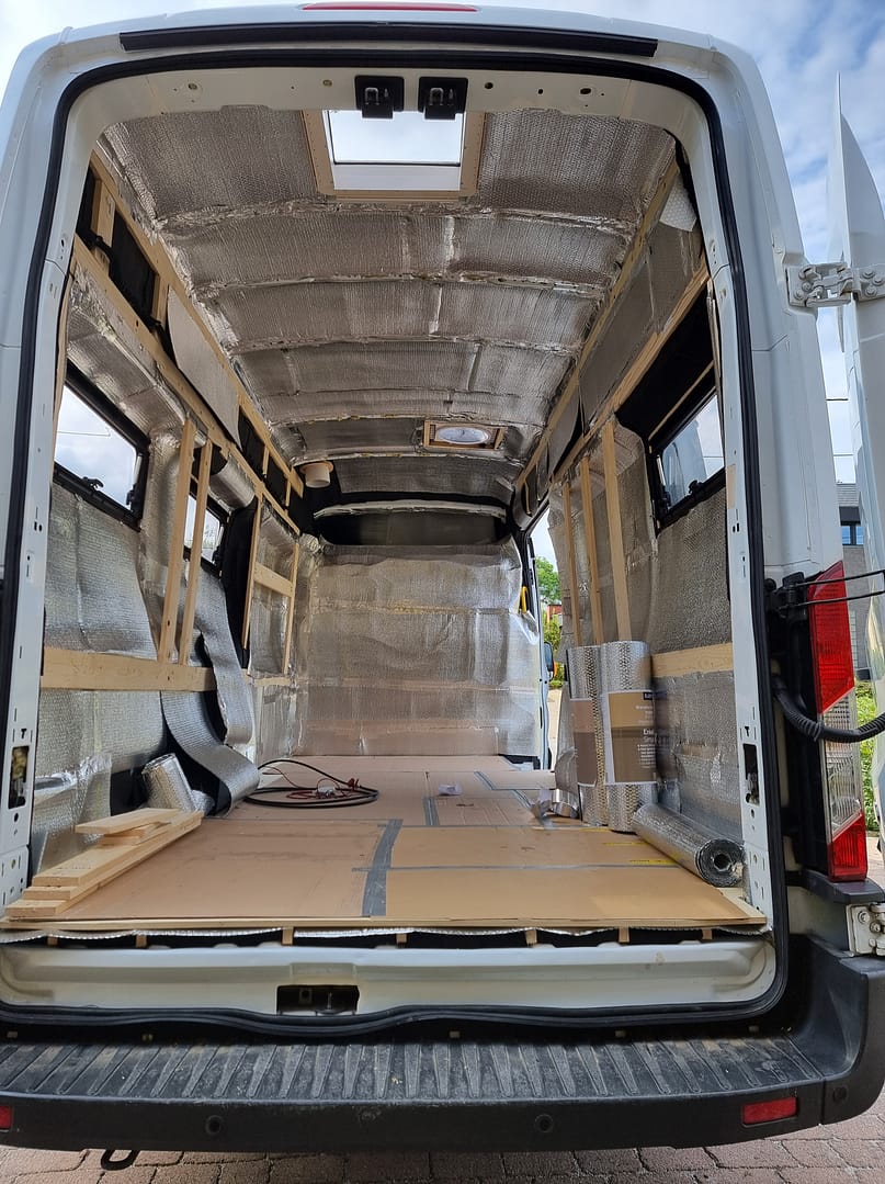 Wel, nadat onze campervan gestript was en z’n raampjes had gekregen was het tijd om te beginnen isoleren. Even voor de volledigheid melden dat er eerst trillingsplaten werden aangebracht op alle wanden, het plafond en de wielkassen.