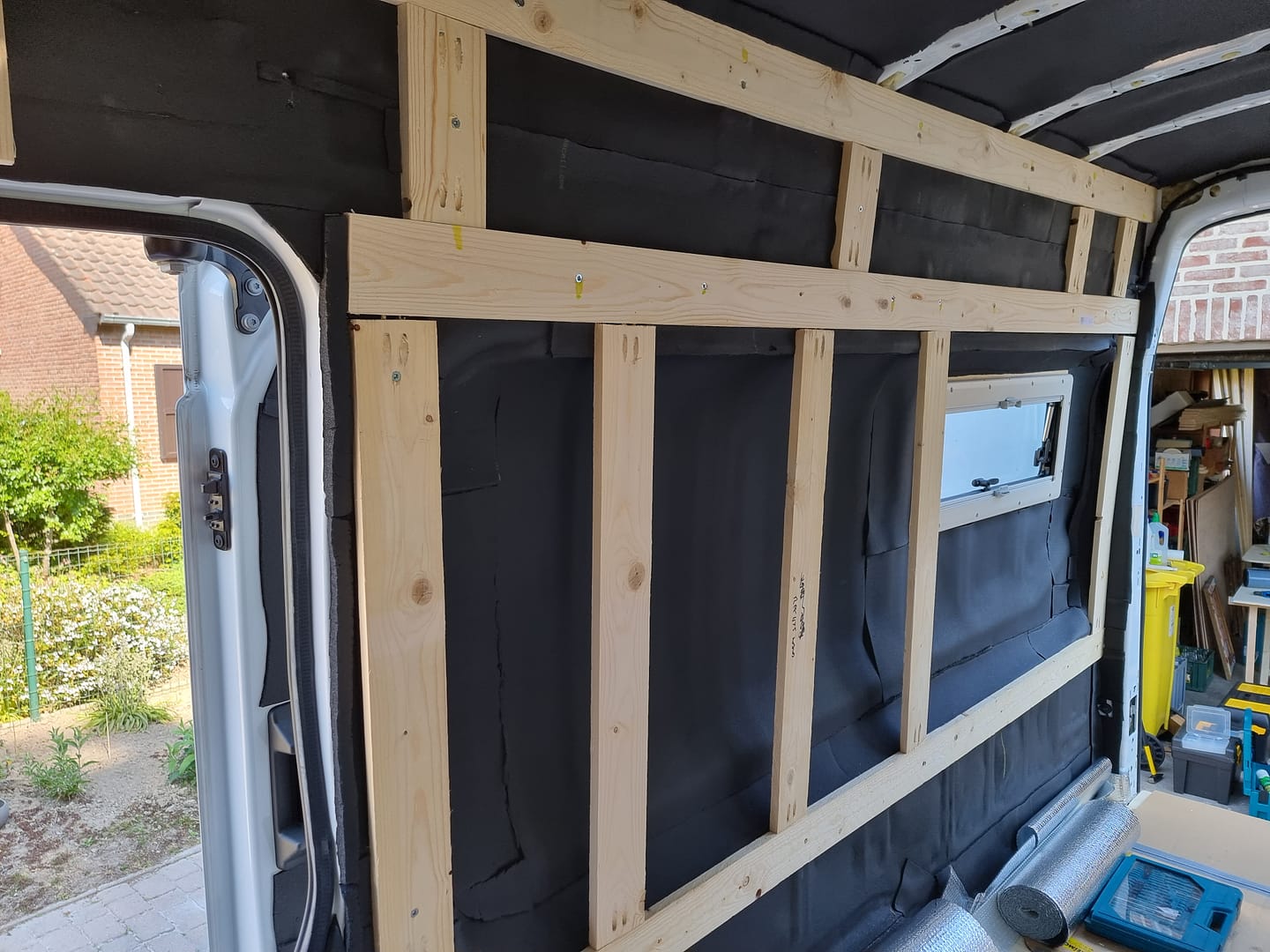 Wanneer de isolatie en vochtbarrière geïnstalleerd is: hang je houten frame op. Hiervoor hebben wij gebruik gemaakt van de gaten die al in onze Ford Transit aanwezig waren.
