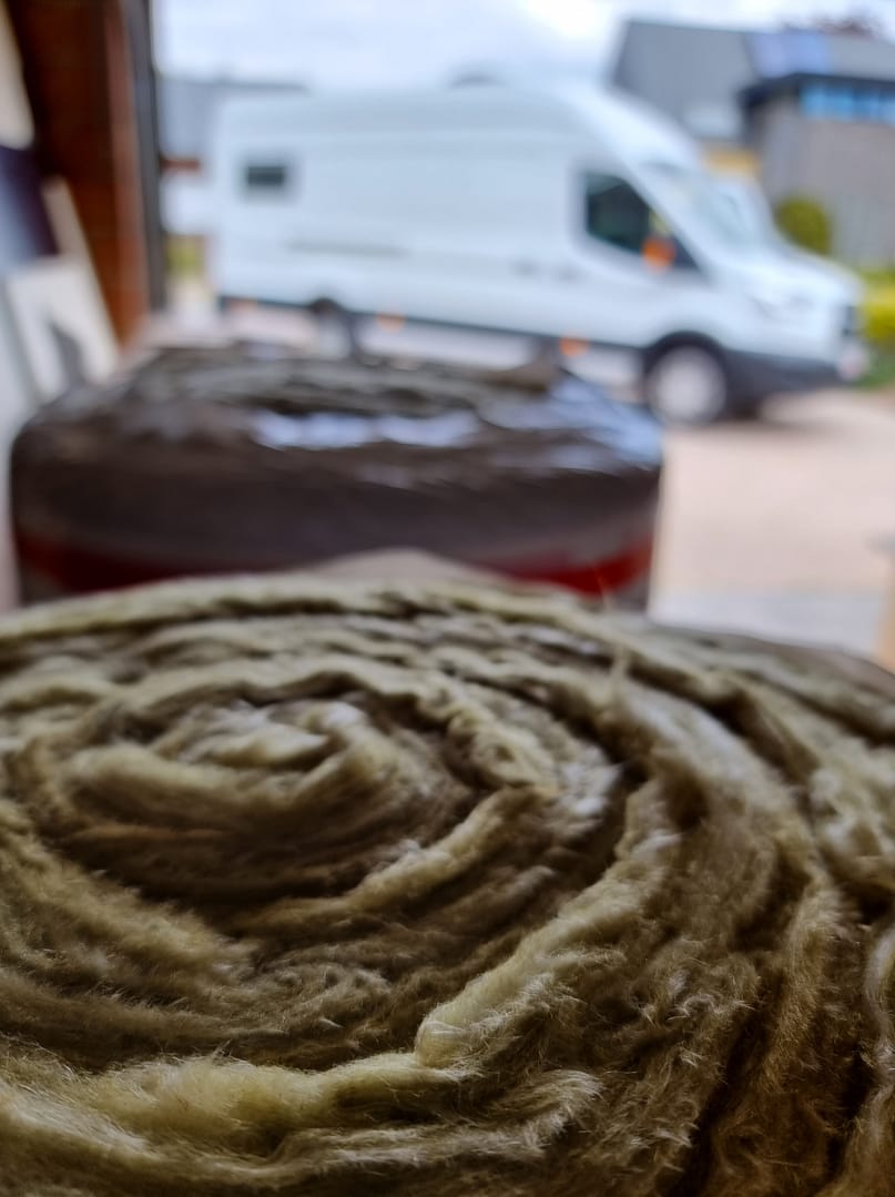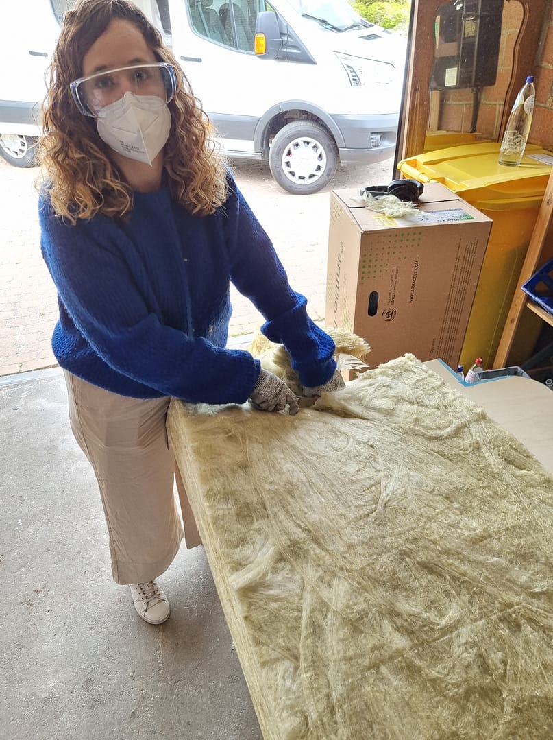 - Wij hebben de steenwol in willekeurige groottes gesneden, enerzijds omdat ik (Anneke) de taak moest volbrengen en ik niet graag exact afmeet en anderzijds omdat zo’n campervan toch 1001 rare krommingen, bochten, plekken heeft dat alles exact afmeten me nutteloos leek.