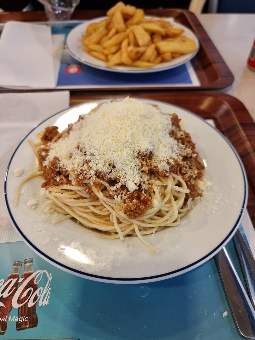 Voor ’s avonds hadden we onze boterhammetjes voorzien, maar de dag erna, kozen we voor het restaurant. Een soort Lunch Garden, maar dan op z’n Grieks. Aanschuiven, wijzen en dan een portie krijgen waarvan je twijfelt of de man achter de toog het meende of ons nu gewoon aan het testen was. Laat ons duidelijk zijn, dat bord lag heel vol. Zo vol, dat de vrouw voor ons, het uit haar handen liet vallen, “sorry” zei, er over stapte en met een ander bord naar de kassa vertrok.
