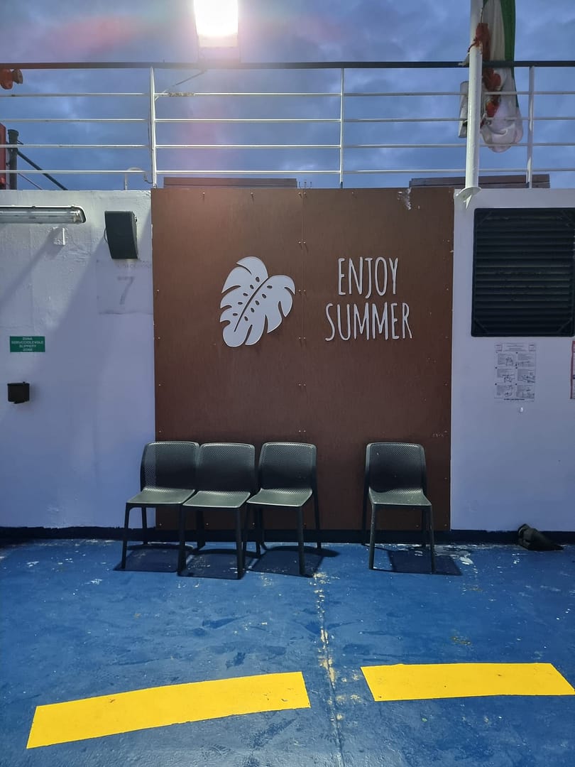 Ons schip, de ‘Venezia’ had twee verdiepen met cabines. Daarnaast waren er een aantal gewone zitgelegenheden. Een plek met ‘vliegtuigstoelen’, een bar (inclusief charmezanger, hij zat al klaar om te beginnen toen we passeerden) en een restaurant. Ook was er een klein winkeltje waar je een extra paar witte kousen kon kopen (en nog een aantal dingen die je zeker niet nodig had) en een kinderspeeltuin. Deze deur bleef echter dicht de hele reis. Niet duidelijk wat ze hier mee bedoelden. Op bepaalde plekken hingen ook A4’tjes op met de boodschap ‘niet kamperen’. Niemand gezien die zijn tent opzette, moesten jullie die vraag gehad hebben.