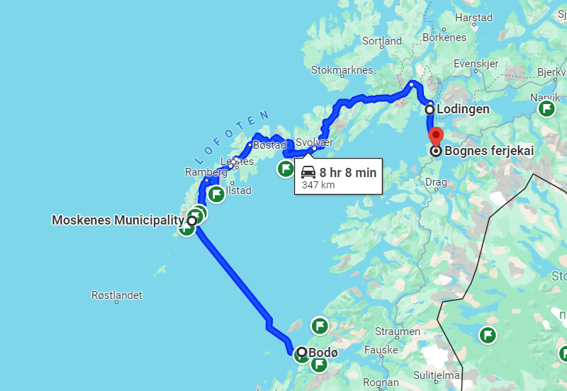 Origineel was het plan om de ferry terug te nemen tussen Lodingen en Bognes. Hierdoor win je wat tijd als je terug meer richting het zuiden wil rijden (en ja, ferries zijn leuk), maar uiteindelijk reden we nog verder door tot het noorden, tot in Tromso en zijn we dus nooit tot aan die ferry geraakt. Ter compansatie namen we later nog een tiental andere ferries. Kudo’s voor de Noorse overheid: dat gaat zeer vlot!)